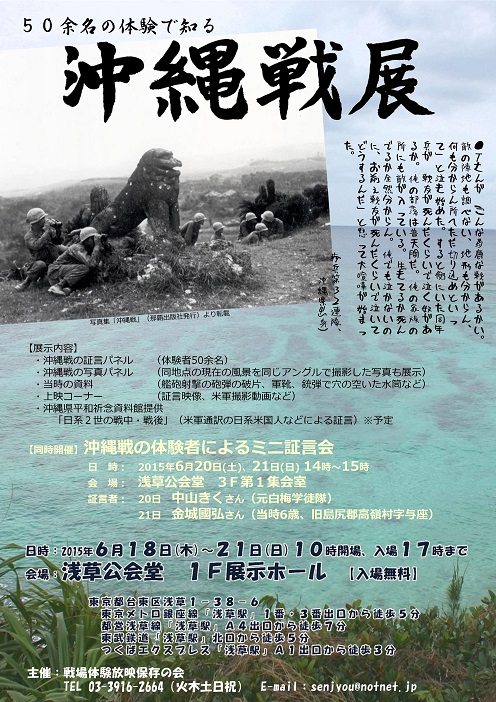 沖縄戦展 浅草公会堂 コメントを残す http://www.jvvap.jp/ 戦場体験史料館・電子版 6月21日、沖縄戦展行ってきました。艦砲射撃の砲弾の破片5センチ×10センチの実物を手に取ると、見た目以上に非常に重く、早いスピードで当たれば、即死するのは確実だと思いました。戦後70年を経ても、沖縄の方々に平和の安らぎというものは、皆無ではないでしょうか。戦後生まれの政治家による連日の国会での議論は、戦場の真実の前では時間を無駄にする机上の空論でしかありません。 仮収容所に入れられた日本兵 爆雷を肩に、戦車に肉迫攻撃しようとして射殺された少年兵